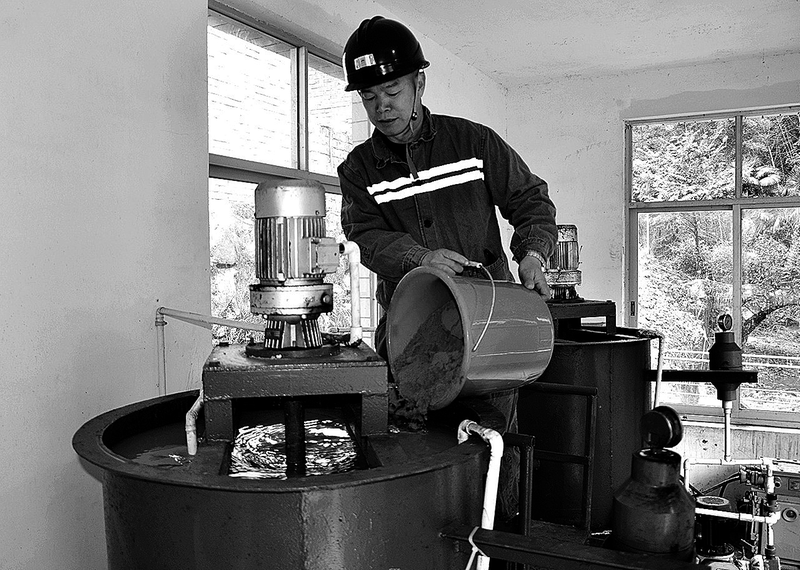 ▲今年以來,永安煤業(yè)公司池坪蘆坑煤礦認(rèn)真抓好環(huán)境保護(hù)工作,使礦區(qū)的污水全部達(dá)標(biāo)排放。圖為4月1日,該礦職工在污水處理站的加藥裝置里投放聚合氯化鋁。(陳思洲 攝)