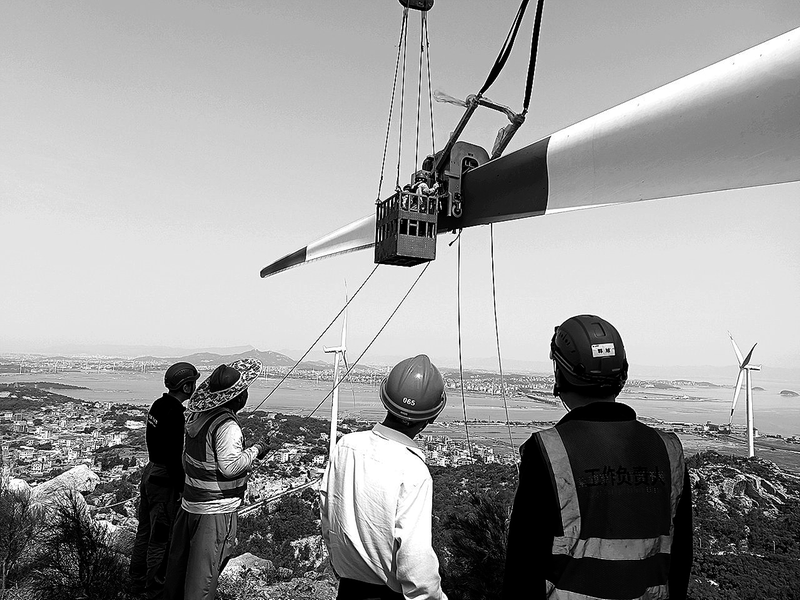 五一期間,福能新能源公司維檢中心把握貧風窗口,以高度的責任感和使命感堅守在機組檢修一線。圖為該公司頂巖山風電場更換偏航齒圈時進行葉片固定。