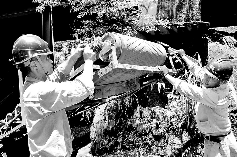 近期,天氣十分炎熱,永安煤業(yè)公司池坪蘆坑煤礦廣大職工在烈日下堅(jiān)守在各自的崗位上。圖為6月26日,該礦機(jī)運(yùn)隊(duì)職工冒著酷暑在排矸點(diǎn)更換損壞的皮帶機(jī)驅(qū)動(dòng)輪。