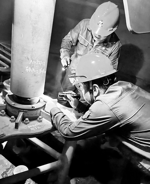 當A-521-2攪拌機具備檢查條件后,設備員們毅然鉆進宛如蒸籠的容器,手持強光手電一寸寸掃過軸瓦,同時迅速記錄下關鍵數(shù)據(jù)。汗水模糊了他們的視線,但他們只是匆忙用衣袖一抹,隨即又全神貫注投入工作中。在檢修過程中,他們以專業(yè)技能為刃,以嚴謹態(tài)度為盾,不遺漏任何細微問題,全力守護設備平穩(wěn)運行,為企業(yè)生產(chǎn)筑牢安全防線。