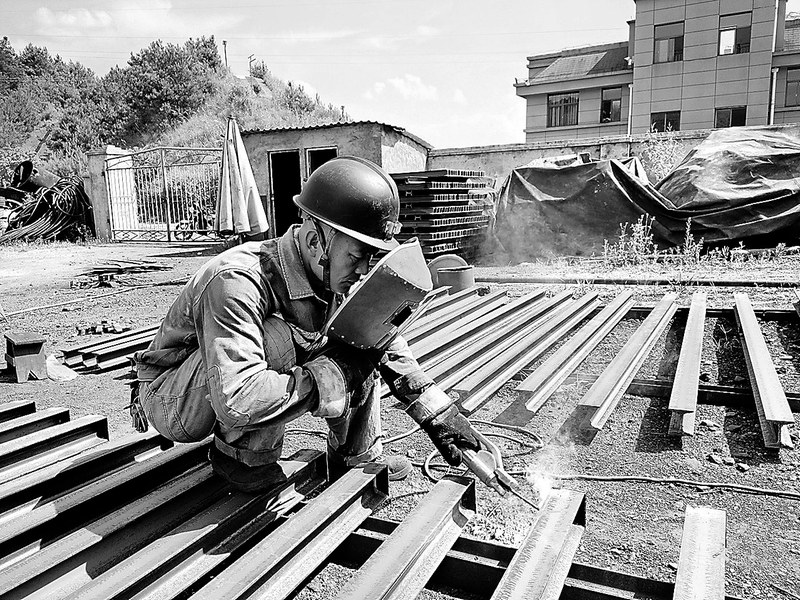 夏日炎炎,熱浪滾滾。在永安煤業(yè)公司仙亭煤礦生產(chǎn)現(xiàn)場,有一群不服“暑”的“鋼鐵漢子”,戰(zhàn)高溫、斗酷暑,奮戰(zhàn)在檢修一線,全力保障各系統(tǒng)安全生產(chǎn)穩(wěn)定運(yùn)行。圖為近日,工人在烈日下加工礦工棚。(陳先臻 攝)
