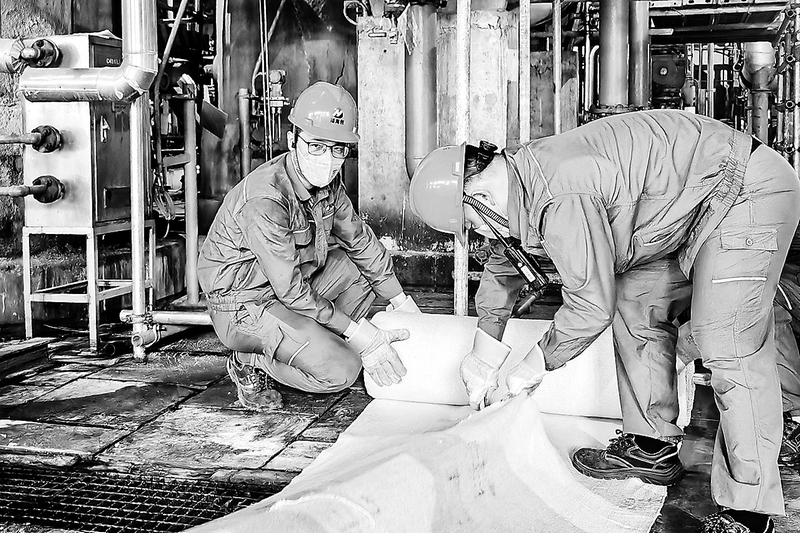 近日,福海創公司開展設備檢修工作。圖為檢修團隊作業人員仔細調整每一寸防火毯的位置,確保地溝完全覆蓋,為動火作業提供可靠安全保障。 (呂婧 陳小平 攝)
