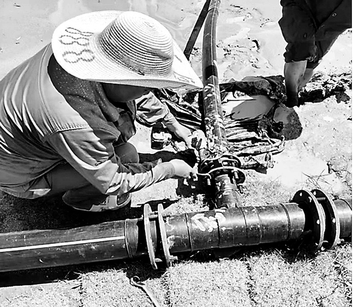 7月1日,高溫炙烤大地,借著檢修停止放礦期間,浦城礦業臨江浮選廠尾礦排放蝶閥磨損過度急需更換,關聯管道堵塞待清。尾礦工經過一上午的奮戰,最終讓新蝶閥嚴絲合縫安裝到位,管道順利暢通如初。 (陳泓希 攝)