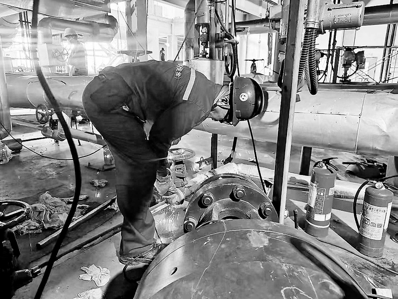 近日,古雷熱電公司開展設(shè)備檢修工作。圖為汽機(jī)檢修中工作人員正在打磨閥門。 (鹿豪 朱漢森 攝)