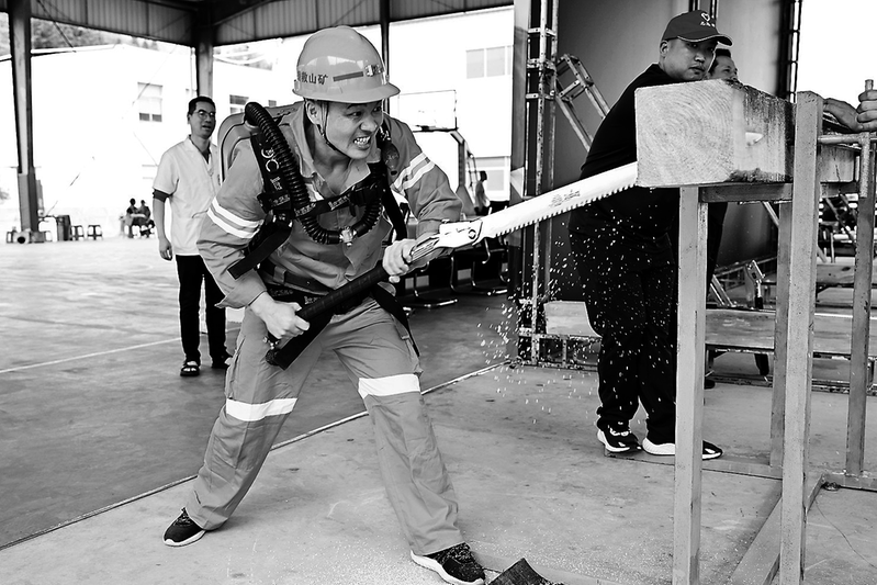 為了練就過硬本領,蘇榮桂的日常訓練近乎“殘酷”。在濃煙彌漫、50℃高溫的模擬環(huán)境中,他佩戴氧氣呼吸器完成鋸木頭、打點柱、扛沙包等高強度科目;每天負重20公斤跑2000米,每周5000米越野跑更是雷打不動。他甚至主動加碼,將檢力器重量增至30公斤,負重背心里多塞兩塊鐵片,沖坡跑比別人多跑兩三趟。同事們常說:“小蘇那訓練服,每天都能擰出水來。”