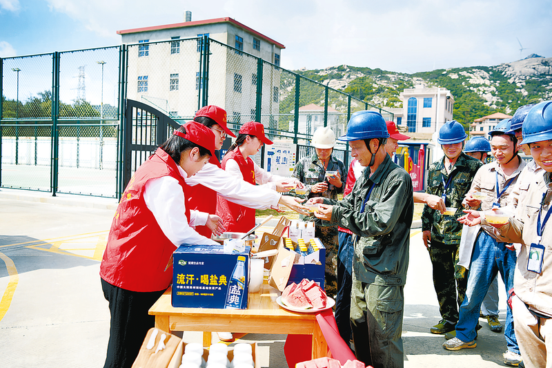 8月19日,三川風電公司組織志愿者前往年檢現場,開展“送清涼”志愿服務活動,為檢修人員送去了綠豆湯、菊花茶、西瓜等防暑降溫物品。