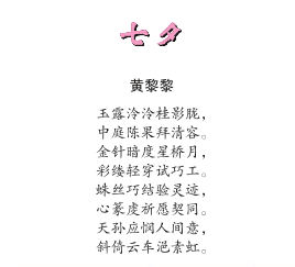黃黎黎玉露泠泠桂影朧,中庭陳果拜清容。金針暗度星橋月,彩縷輕穿試巧工。蛛絲巧結(jié)驗靈跡,心篆虔祈愿契同。天孫應(yīng)憫人間意,斜倚云車浥素虹。