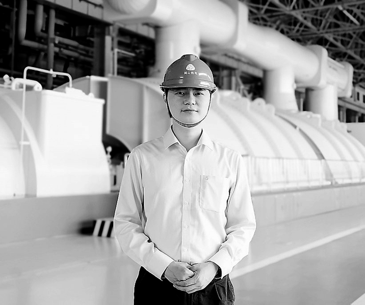 圖為陳佳彬在汽輪機(jī)前接受采訪