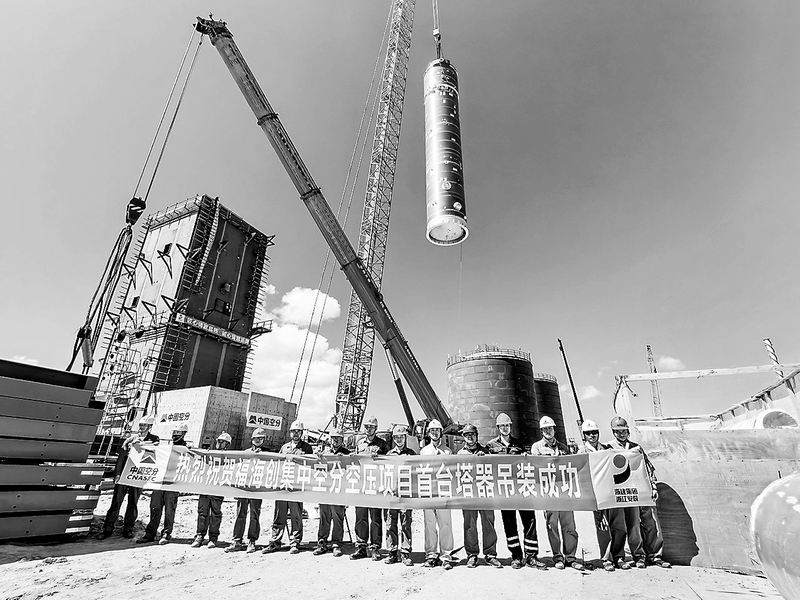 9月28日,福海創(chuàng)公司空分裝置建設(shè)迎來重大進展:作為分餾系統(tǒng)核心的下塔與冷凝蒸發(fā)器組合體順利完成一次性精準(zhǔn)吊裝,標(biāo)志著項目主要設(shè)備安裝取得階段性重大突破。(林華麗陳福清 攝)