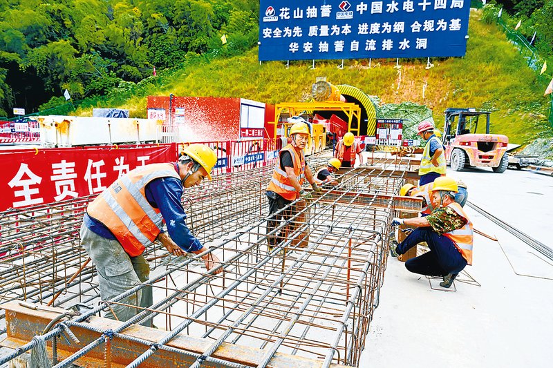 圖為建設(shè)者們在自流排水洞口TBM運渣車地錨鋼筋綁扎。