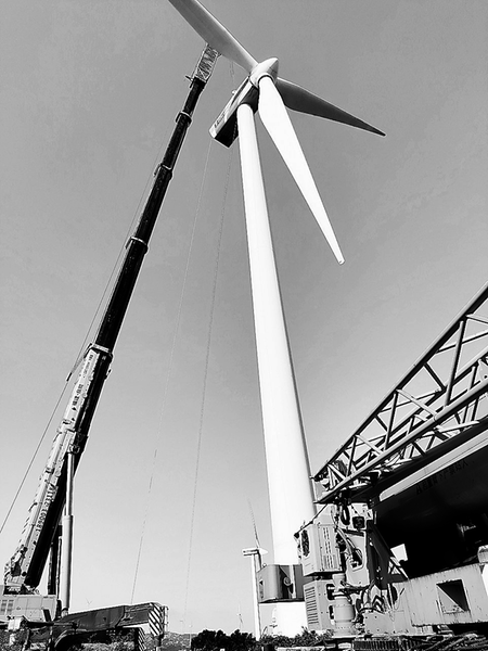 11月8日,福能新能源公司石城風(fēng)電場#2 風(fēng)機趕在“鳳凰”臺風(fēng)來臨前完成齒輪箱吊裝更換工作。(郭阿清 攝)