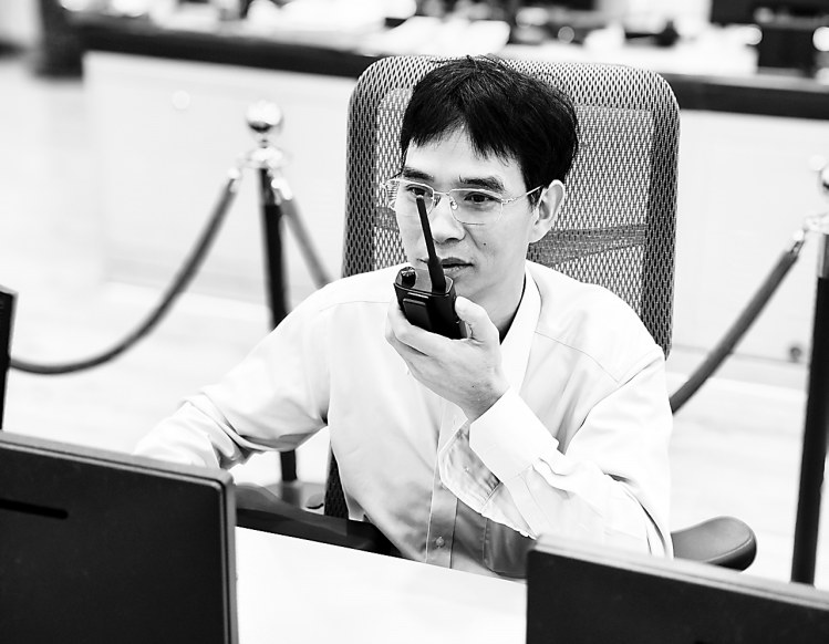 圖為鐘進(jìn)士與現(xiàn)場(chǎng)人員配合投運(yùn)設(shè)備