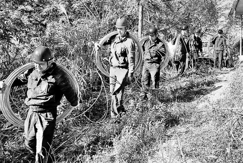 (張建文張萍 攝影報(bào)道)圖為施工團(tuán)隊(duì)正往山上搬運(yùn)鋼芯鋁絞線