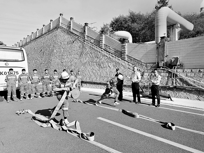 ①11月25日,鴻山熱電公司專職消防隊業(yè)務(wù)技能競賽火熱開賽,16名專職消防隊員同臺競技、切磋比拼,以實戰(zhàn)化標(biāo)準(zhǔn)檢驗訓(xùn)練成效,錘煉滅火救援硬本領(lǐng)。 (陳建華 攝)