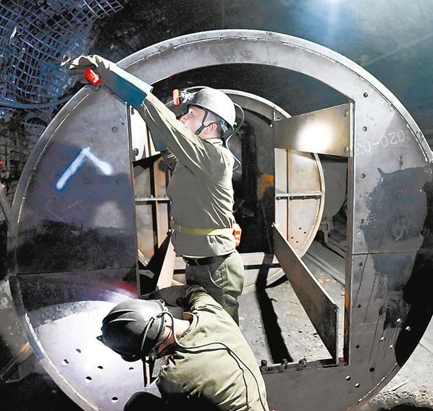 福建煤電公司龍潭煤礦將井下煤倉1#舊翻滾籠更換工作列入重點工作抓緊抓實,為新一年礦井安全生產夯實設備基礎。圖為2月7日,廠家技術人員在井下煤倉現場調整新翻滾籠安裝尺寸。 (陳思忠 攝)