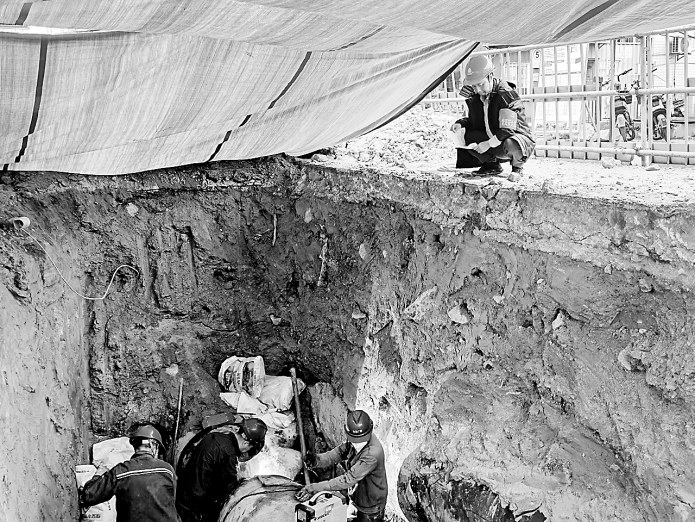 搶修現(xiàn)場正值降雨天氣,施工條件十分復(fù)雜。機(jī)械轟鳴聲中,搶修人員連續(xù)作業(yè),在泥水混雜的作業(yè)坑中清理作業(yè)面、緊急排水,并對泄漏管段進(jìn)行切割隔離,通過氣密性試驗(yàn)逐段查找漏點(diǎn)。